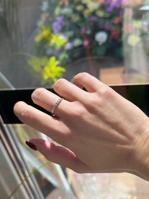 Ten wyjątkowy pierścionek zachwyca subtelną elegancją i mistrzowskim wykonaniem. Smukła obrączka z 14-karatowego żółtego złota stanowi doskonałe tło dla siedmiu lśniących diamentów w oprawie z białego złota. Precyzyjne szlify kamieni wydobywają ich naturalny blask, tworząc harmonijną kompozycję, która przyciąga wzrok. To biżuteria, która podkreśla delikatność i wyrafinowany gust swojej właścicielki.