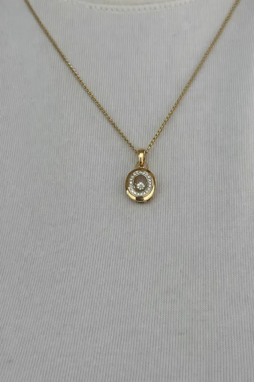 Ta elegancka zawieszka o okrągłej formie zachwyca subtelnym blaskiem i perfekcyjnym wykończeniem. W centrum znajduje się osadzony na specjalnym mechanizmie diament, który porusza się przy każdym, nawet najdrobniejszym ruchu – tworząc wyjątkowy efekt „tańczącego” kamienia. Diament otoczony jest błyszczącym wieńcem mniejszych kamieni, co potęguje jego blask i przyciąga spojrzenia.
