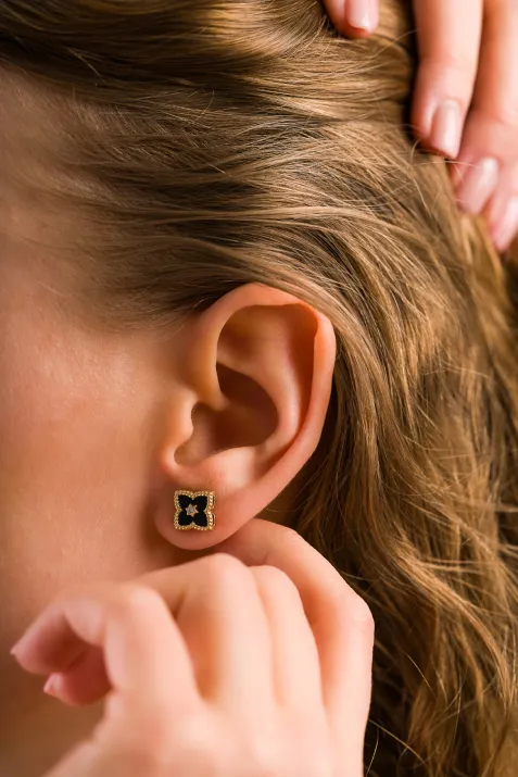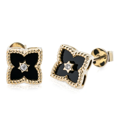 Eleganckie kolczyki wykonane z żółtego złota, których centralnym punktem jest czarny onyks w kształcie koniczynki. Każdy kolczyk został ozdobiony delikatnym diamentem osadzonym w gwiaździstym motywie, który dodaje całości subtelnego blasku. Ozdobna, skręcana ramka podkreśla luksusowy charakter biżuterii, tworząc wyrazisty, a zarazem klasyczny efekt. Idealne do noszenia na co dzień i na wyjątkowe okazje – dla kobiet ceniących styl, szyk i precyzję wykonania.