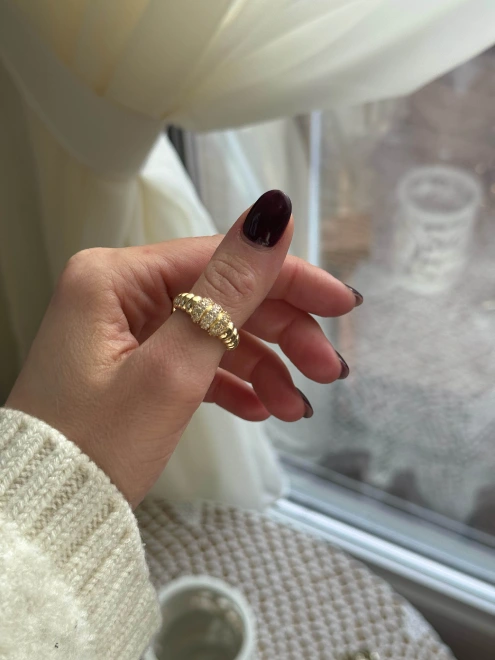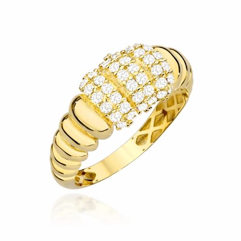 Efektowny pierścionek, którego centralną część biżuterii tworzy szeroka, dekoracyjna forma wysadzana licznymi lśniącymi cyrkoniami, które pięknie odbijają światło, nadając pierścionkowi luksusowego i przyciągającego uwagę charakteru.