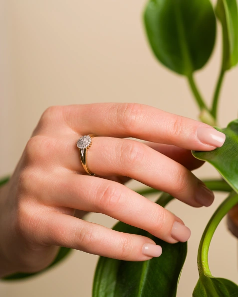 Ten wyjątkowy pierścionek został zdobiony efektowną kompozycją lśniących diamentów, tworzących kwiatowy motyw. Centralna część ozdoby zachwyca bogactwem drobnych kamieni, które razem tworzą spektakularny efekt świetlny, przyciągając wzrok subtelnym, ale wyrazistym blaskiem. Delikatnie rozszerzana obrączka dodatkowo podkreśla elegancję formy, a staranne osadzenie kamieni świadczy o kunszcie jubilerskim.
