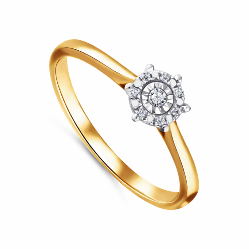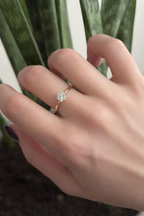 Delikatny pierścionek z żółtego złota, ozdobiony centralnym diamentem otoczonym subtelną koroną mniejszych diamentów. Smukła, polerowana obrączka pięknie podkreśla blask kamieni, nadając całości wyjątkowej lekkości i elegancji. Klasyczna forma w nowoczesnym wydaniu sprawia, że pierścionek doskonale sprawdzi się zarówno jako symbol zaręczyn, jak i ponadczasowa biżuteria na wyjątkowe okazje.
