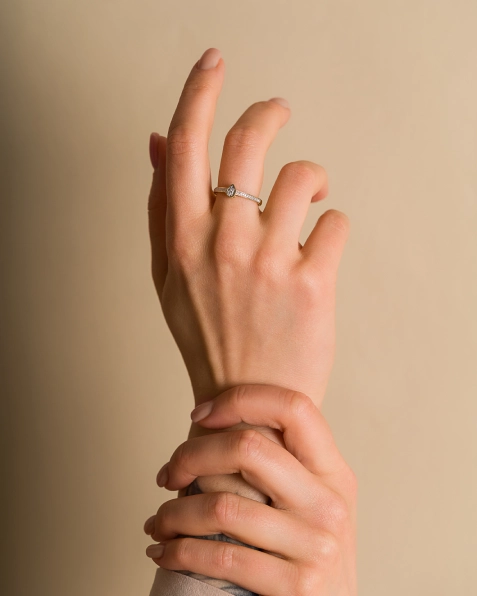 Ten pierścionek to połączenie klasyki i nowoczesnego designu. Centralny punkt stanowi olśniewający diament w kształcie łezki, osadzony w gładkiej oprawie, która podkreśla jego unikalny kształt i pięknie odbija światło. Po bokach obrączki osadzono rząd drobnych, lśniących diamentów, które nadają całości dodatkowego blasku i wyrafinowania. Smukła forma pierścionka sprawia, że jest niezwykle elegancki i doskonale prezentuje się na dłoni.