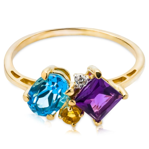 Złoty pierścionek 585 z niebieskim Topazem, Ametystem, Cytrynem i diamentem 0,022ct