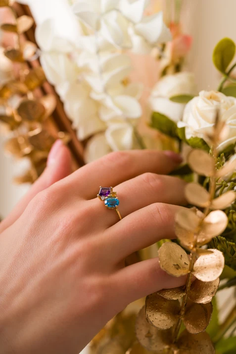 Zachwycający pierścionek wykonany z żółtego złota, przyciągający wzrok nietuzinkową kompozycją kolorowych kamieni szlachetnych. Owalny niebieski topaz, kwadratowy fioletowy ametyst oraz okrągły cytryn tworzą unikalne zestawienie barw, które dopełnia subtelny diament lśniący przy mocowaniu. Asymetryczny układ i kontrastujące kolory nadają pierścionkowi nowoczesny, artystyczny charakter. Idealny wybór dla kobiet ceniących oryginalność, kolor i elegancję w biżuterii.