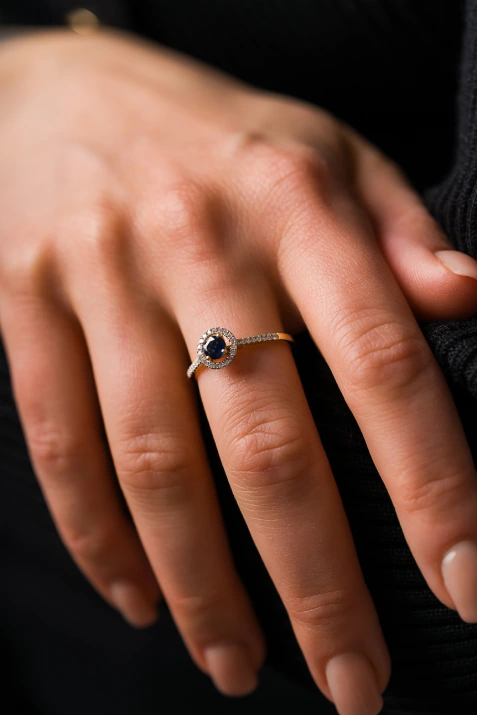 Ten olśniewający pierścionek łączy klasyczne piękno żółtego złota z głęboką, hipnotyzującą barwą niebieskiego szafiru. Centralny kamień – fasetowany szafir – osadzony jest w koronie z drobnych, lśniących diamentów, które podkreślają jego wyjątkowy kolor i nadają całości luksusowego charakteru. Dodatkowe diamenty zdobiące obrączkę wzmacniają efekt blasku i sprawiają, że biżuteria prezentuje się wyjątkowo efektownie.